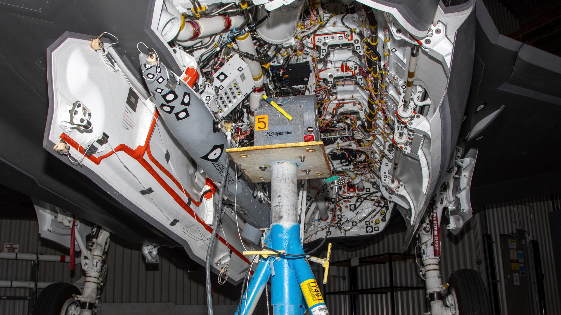 Áö»ó Áøµ¿ ½ÃÇèÀ» À§ÇØ F-35A¿¡ ¹ÌƼ¾î¸¦ žÀçÇß´Ù. ÀÌ ½ÃÇè¿¡¼´Â ¹Ì»çÀÏÀ» ´Ù¾çÇÑ Á֯ļö·Î Èçµé¾î ±¸Á¶Àû ¹ÝÀÀÀ» ÃøÁ¤Çß´Ù.(»çÁø:F35.com)